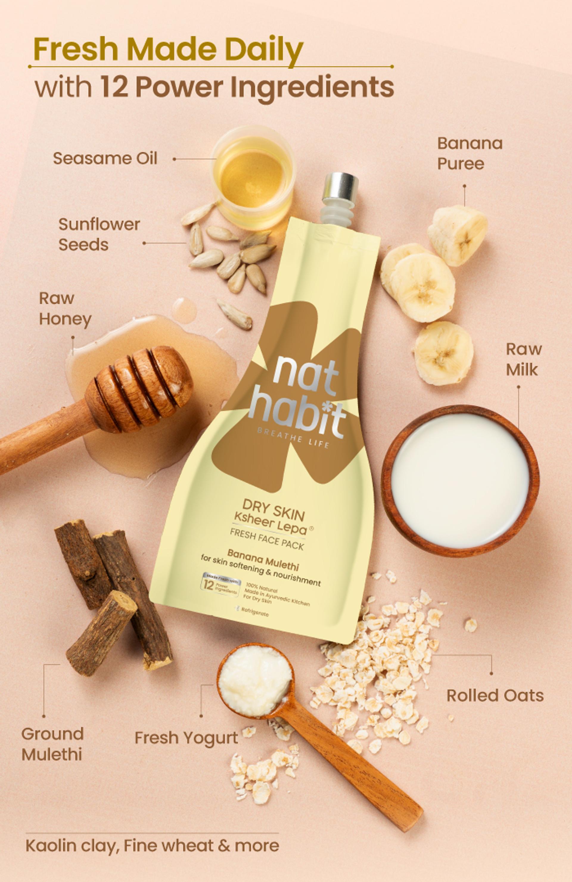 Full Ingredient List: banana, mulethi, sunflower seeds, raw milk, yogurt, oats, kaolin clay, fine wheat, vanilla, raw honey, sugar, salt & sesame oil.
