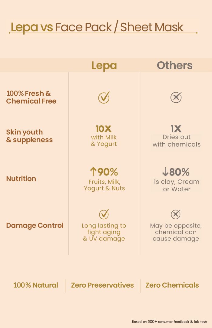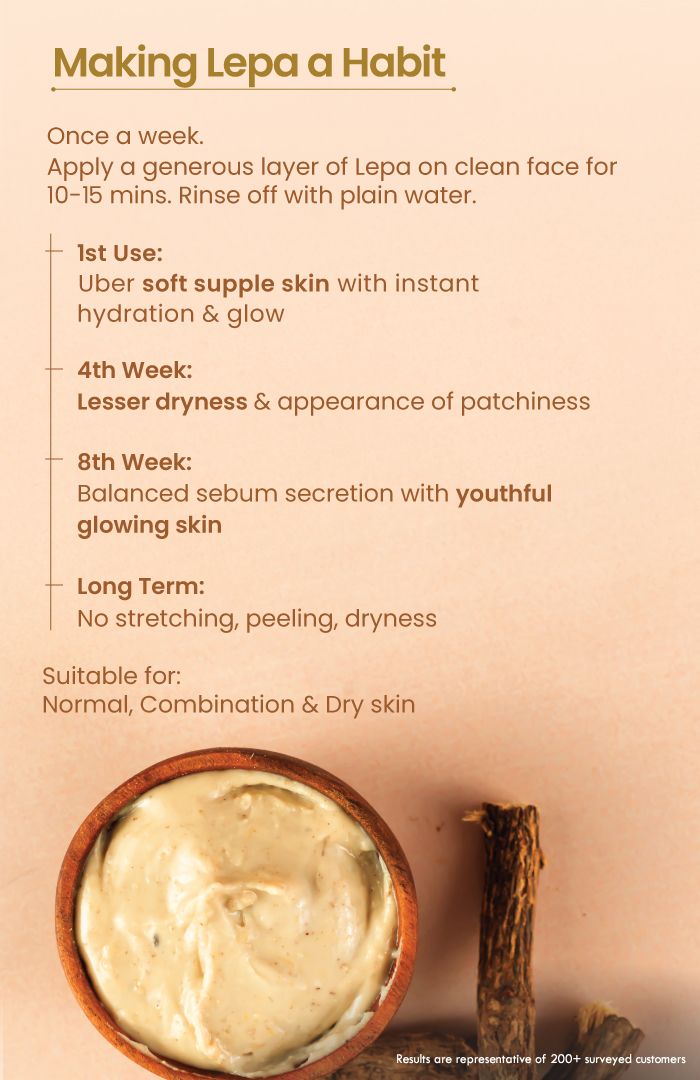 On clean face, apply a THICK layer of Fresh Ksheer Lepa generously. Apply on neck too. Pat some water if required, for better spreadability. Let the Lepa dry for 10-15min. Gently rinse or towel wipe with plain/lukewarm water. You'll find your skin feeling fresh, supple & nurtured. Moisturise face after drying. Recommended to use twice weekly for soft, nourished & radiant skin.