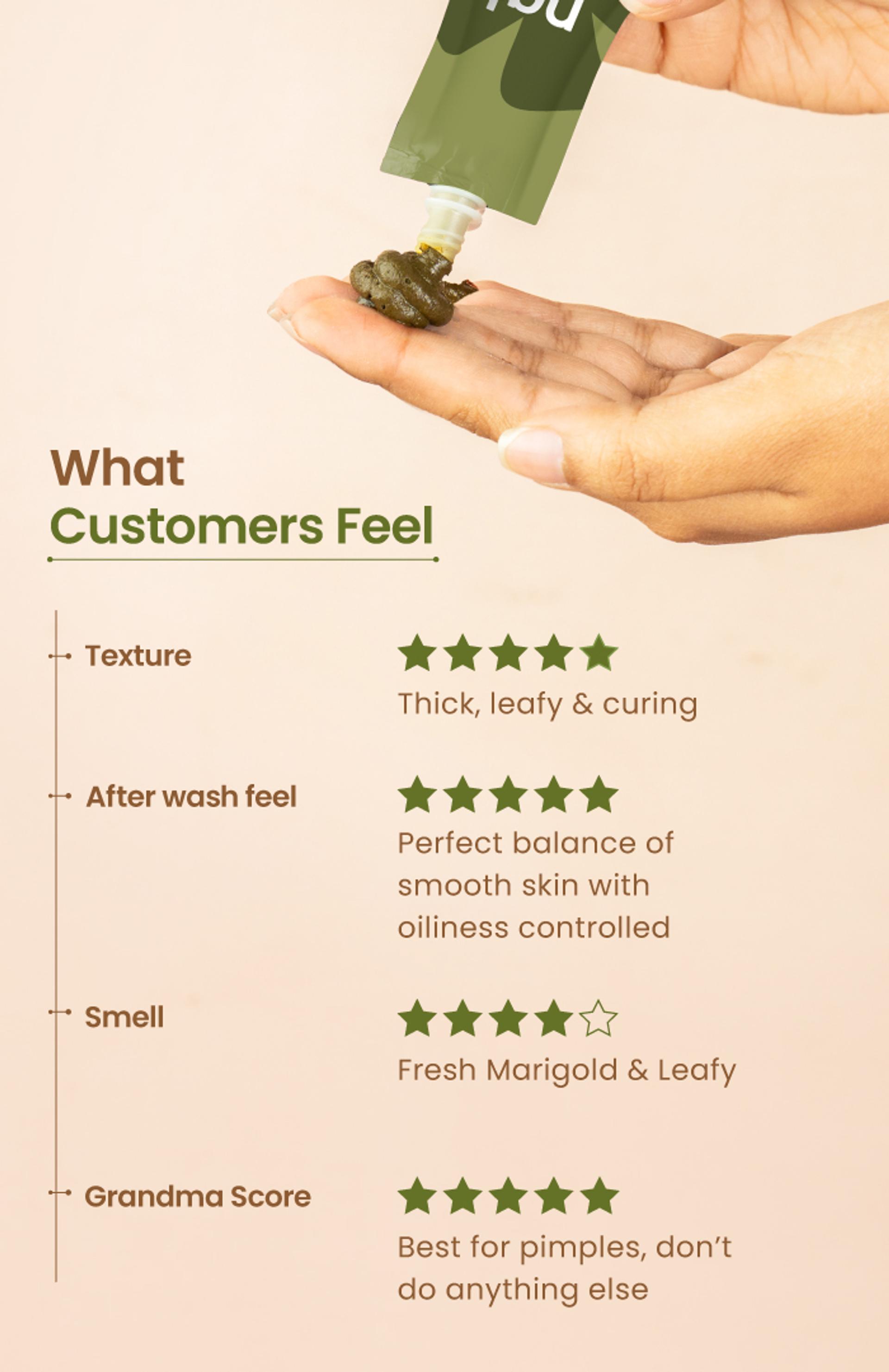 Full Ingredient List: neem, ajwain, tea tree, sun-dried marigold, raw milk, yogurt, mulethi, vetiver, raw honey, sugar, salt, bentonite, besan & sesame oil.