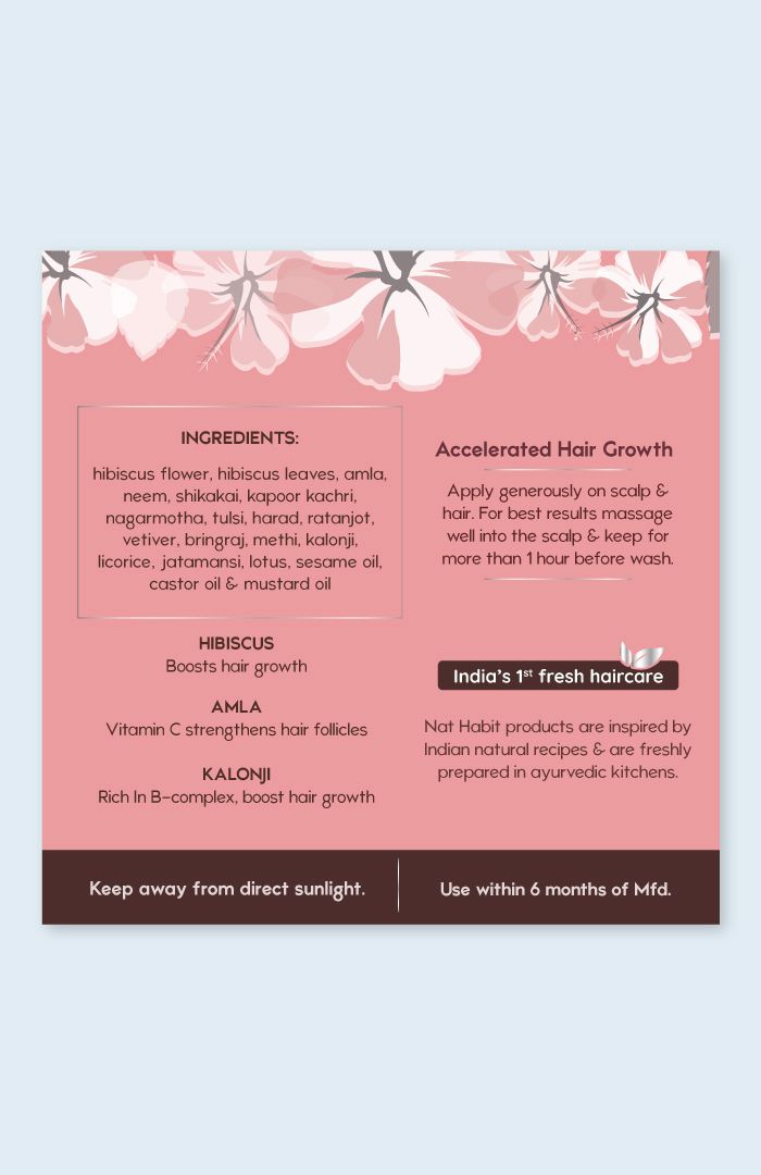 Full Ingredient List: hibiscus flower, hibiscus leaves, amla, kalonji, neem, shikakai, kapoor kachri, nagarmotha, tulsi, harad, ratanjot, vetiver, bhringraj, methi, licorice, jatamansi, lotus, sesame oil, castor oil, mustard oil.