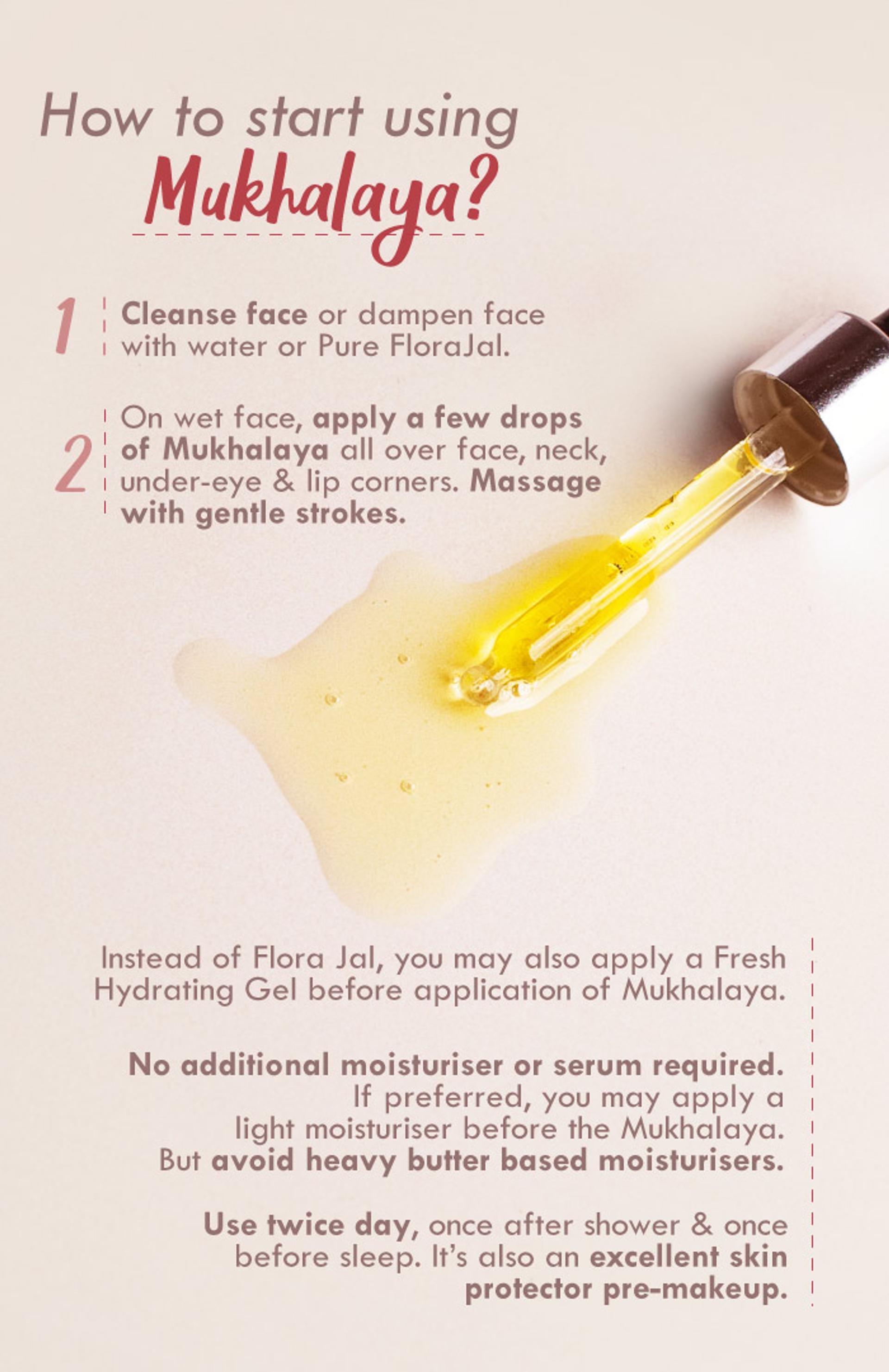 No additional moisturiser or serum required. If preferred, you may apply a light moisturiser before the Mukhalaya. But avoid heavy butter based moisturisers.