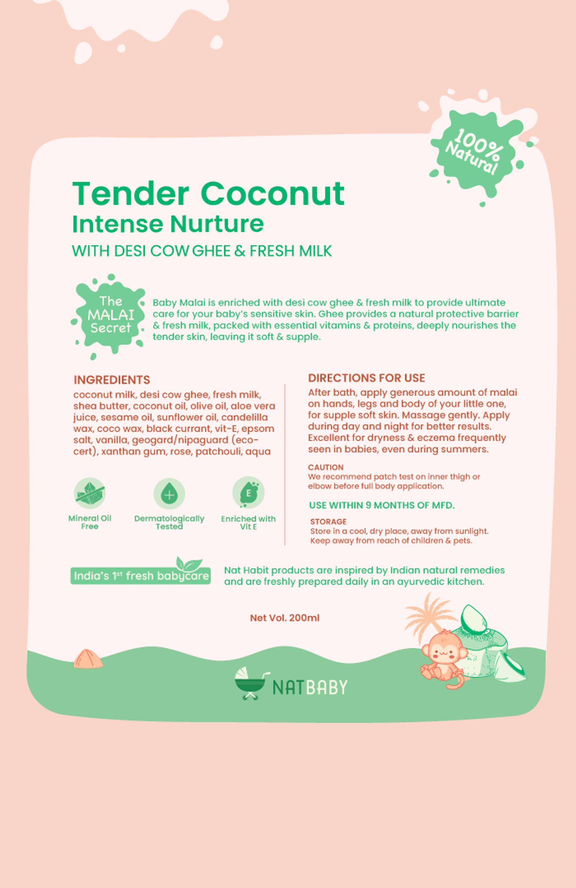 Baby’s semi-permeable skin absorbs the richness of Malai’s active vitamins, fats, proteins, and nutrients. It helps in delivering deep moisture, protecting the skin barrier, and helping regulate their body temperature to leave soft, supple skin with loads of giggles. MALAI care - 100% Natural. 0% Chemicals.
